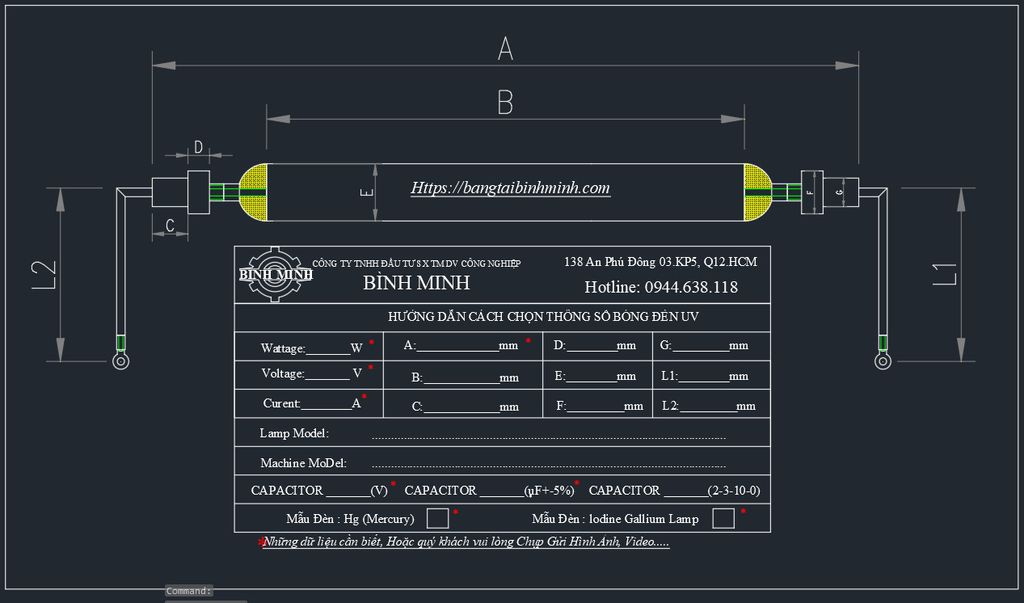 | Lưu ý: 1. Khi lắp đèn phải lau sạch bằng cồn, khi lắp đèn không buộc phải tránh làm đèn nổ. Đèn phải được sử dụng kết hợp với chấn lưu và tụ điện thích hợp, 2. Đèn có đầu ra UV mạnh, chú ý đến công việc để tránh bị bỏng và chói mắt.