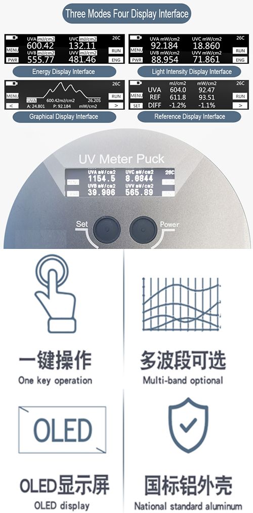 UV Meter Puck có thể đo đồng thời bốn giá trị bước sóng UV khác nhau thông qua cùng một quy trình UV. Bước sóng mặc định là UVA (320-395nm), UVB (280-320nm), UVC (250-260nm), UVV (395-445nm). So với UV Meter Plus, UV Meter Plus chỉ cho phép bạn chọn một dải bước sóng. Các chỉ số UV Meter Puck chứa tổng năng lượng UV và cường độ bức xạ đỉnh trên bốn dải dải UV. Tuy nhiên, UV Meter Plus chỉ có thể đo và hiển thị một trong các giá trị bước sóng này.